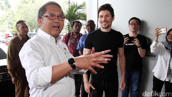 Pavel Durov, pendiri Telegram, juga cuma berkaus oblong hitam lengan pendek saat menyambangi Menteri Komunikasi dan Informatika Rudiantara.